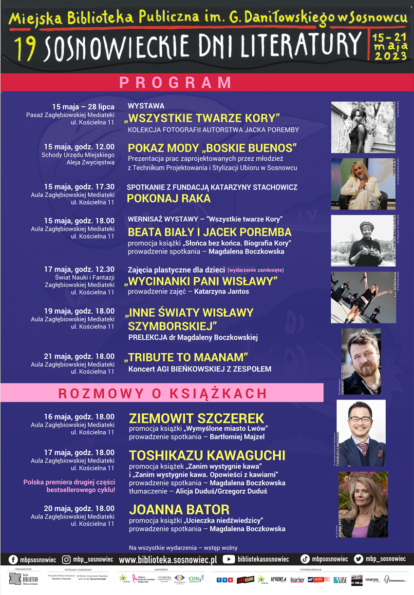Zaprasza się do uważnego śledzenia strony internetowej MBP: www.biblioteka.sosnowiec.pl i jej profilów w mediach społecznościowych. Szczegółowy program 19. Sosnowieckich Dni Literatury dostępny jest także na afiszach i w informatorach kolportowanych na terenie całego regionu.