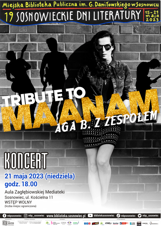Miejska Biblioteka Publiczna w Sosnowcu – Organizator 19. Sosnowieckich Dni Literatury – serdecznie zaprasza w niedzielę 21 maja 2023 o godz. 18.00 do Auli Zagłębiowskiej Mediateki przy ul. Kościelnej 11, na wielki finał 19. SDL – koncert „TRIBUTE TO MAANAM” w wykonaniu Agi Bieńkowskiej z Zespołem. Zapraszamy w tę wyjątkową muzyczną podróż – podczas koncertu usłyszycie największe przeboje grupy Maanam. Wstęp wolny.