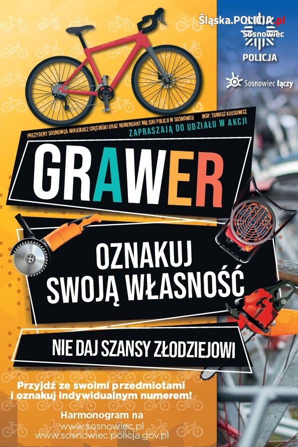 Sosnowieccy policjanci 30 czerwca w godzinach 16:00-18:00 przy kasach kompleksu piłkarskiego przy ulicy Kresowej w ramach akcji “GRAWER-oznakuj swoją własność”, znakować będą rowery i inne należące do mieszkańców miasta przedmioty.