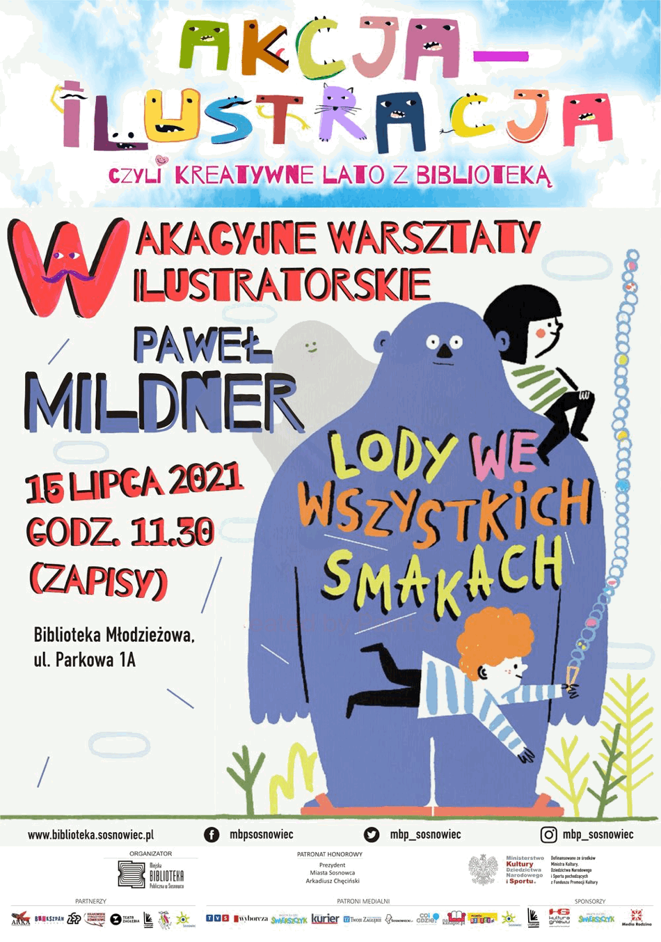 Miejska Biblioteka Publiczna w Sosnowcu – organizator wakacyjnego projektu „Akcja-ilustracja, czyli kreatywne lato z biblioteką” – serdecznie zaprasza w czwartek 15 lipca 2021 o godz. 11.30 do udziału w wyjątkowych warsztatach ilustratorskich dla dzieci (w wieku 6-10 lat). Gościem Biblioteki Młodzieżowej przy ul. Parkowej 1A będzie Paweł Mildner – ilustrator, autor książki „Lody we wszystkich smakach”, która stanie się podstawą warsztatów. Wstęp wolny – obowiązują zapisy.