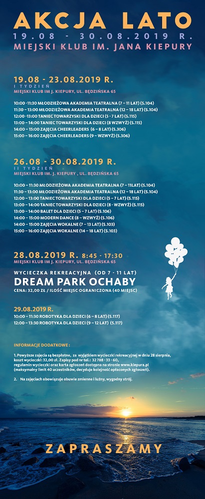 Miejski Klub im. Jana Kiepury zaprasza na Akcje Lato.Więcej informacji na temat zajęć oraz organizowanej wycieczki do Dream Parku, znajdziecie na stronie: www.kiepura.pl Tagi:atrakcjeWydarzenie