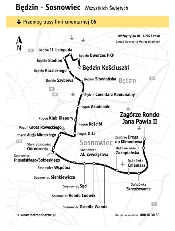 Mimo trwających robót wzdłuż ulicy Wojska Polskiego na czas Wszystkich Świętych zniknie „wahadło” w rejonie skrzyżowania ulic Wojska Polskiego, Watta i Kopalnianej, a ruch będzie się odbywał w obu kierunkach. To pozwoli na płynne poruszanie się ul. Wojska Polskiego zarówno w kierunku cmentarza komunalnego jak i parafialnego. 1 listopada zostanie uruchomiona specjalna bezpłatna dodatkowa linia autobusowa C6. Po raz pierwszy linia ZTM obsłuży dodatkowe nekropolie przy al. Mireckiego oraz 11 listopada. Autobus dojedzie także przed cmentarze mieszczą się przy Andersa i Będzińskiej/Małobądzkiej.