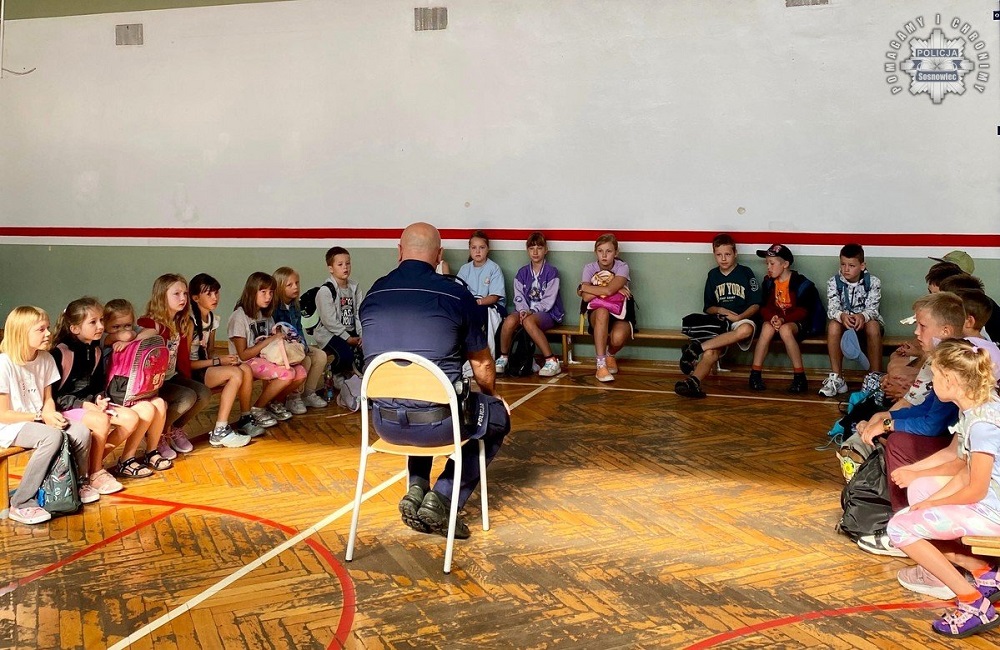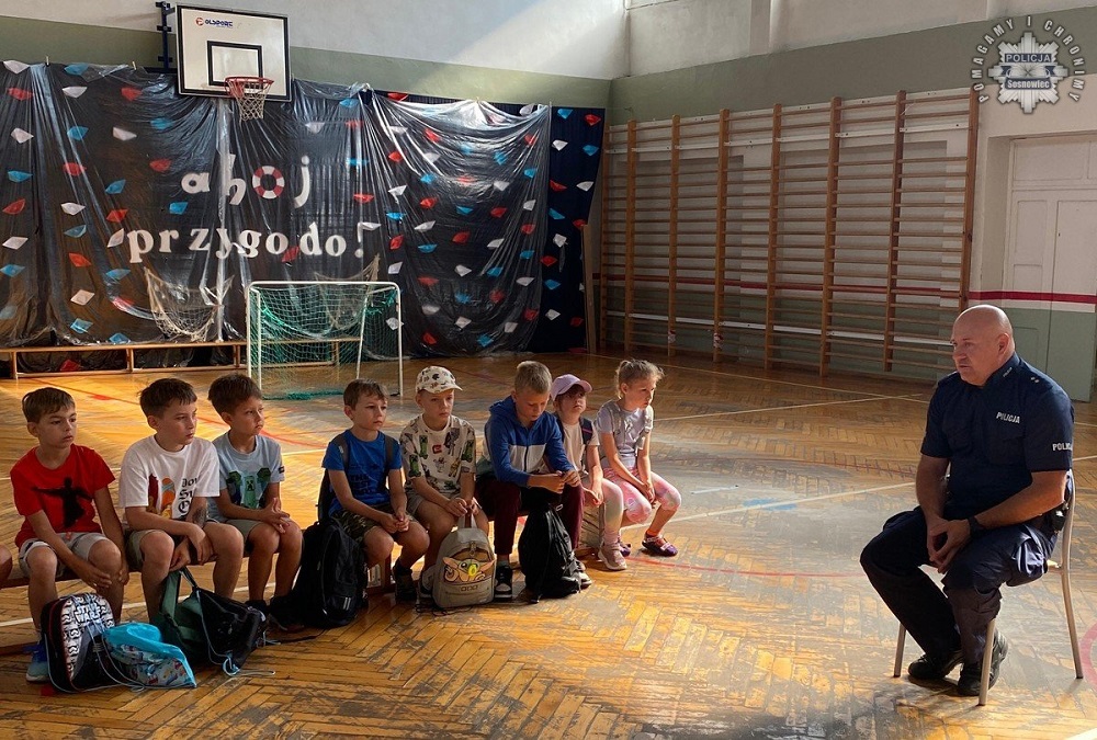 Policjanci z Wydziału Prewencji Komendy Miejskiej Policji w Sosnowcu spotkali się z uczestnikami półkolonii w Zespole Szkół Ogólnokształcących nr 5 przy ul. Bohaterów Monte Cassino. W ramach działań profilaktycznych funkcjonariusze przeprowadzili pogadankę na temat bezpiecznego spędzania wolnego czasu w okresie wakacyjnym.