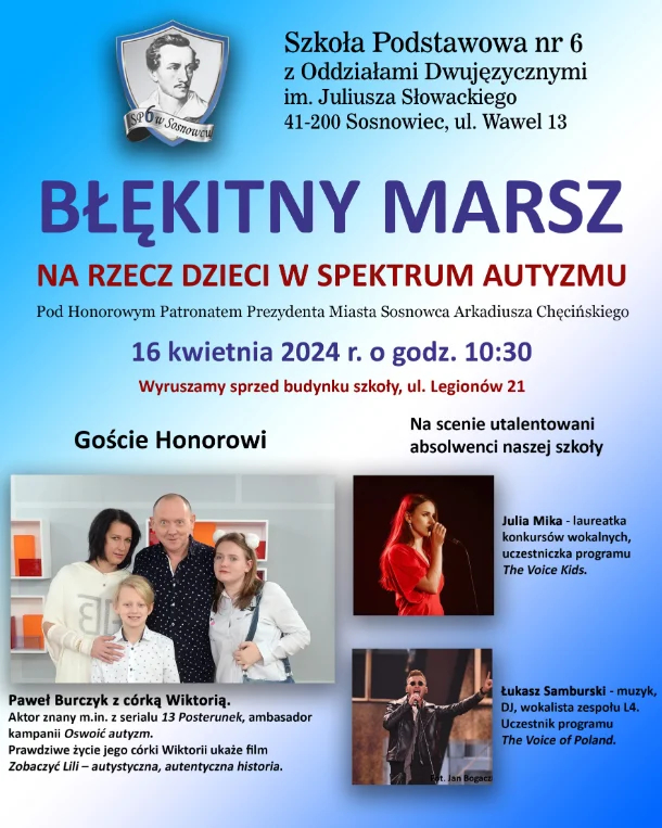 Społeczność Szkoły Podstawowej nr 6 z Oddziałami Dwujęzycznymi im. Juliusza Słowackiego w Sosnowcu serdecznie zaprasza 16 kwietnia 2024 r. do udziału w Błękitnym Marszu na rzecz dzieci w spektrum autyzmu zorganizowanym pod Honorowym Patronatem Prezydenta Miasta Sosnowca Arkadiusza Chęcińskiego.