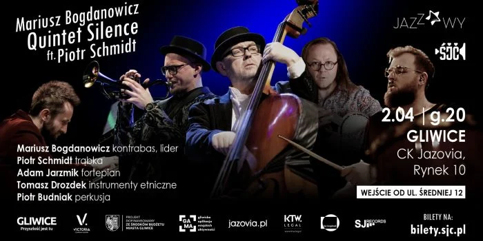 Organizatorzy zapraszają na koncert jazzowy zespołu Mariusz Bogdanowicz Quintet Silence, w którym gościnnie występuje wybitny trębacz i improwizator Piotr Schmidt. Formacja ta łączy w swoich projektach głębokie jazzowe korzenie z nowoczesnym podejściem do improwizacji i brzmienia, prezentując repertuar autorski znanego kontrabasisty z wyraźnym akcentem na fascynującą komunikację między solistą a sekcją rytmiczną oraz na bogactwo melodyczne.