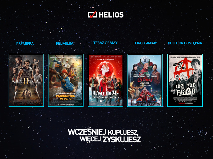 Fantastyczne kontynuacje światowych hitów: „Paddington w Peru” i „Gladiator 2” już w ten piątek zagoszczą na ekranach kin w całej Polsce! Ponadto na widzów Heliosa czekają świąteczne produkcje jak „Listy do M. Pożegnania i powroty” oraz „Czerwona jedynka”, a także popularne seanse specjalne! Jesienne wieczory to idealny moment, by w towarzystwie rodziny i przyjaciół zanurzyć się w filmowych emocjach, które pozostaną w pamięci na długo.