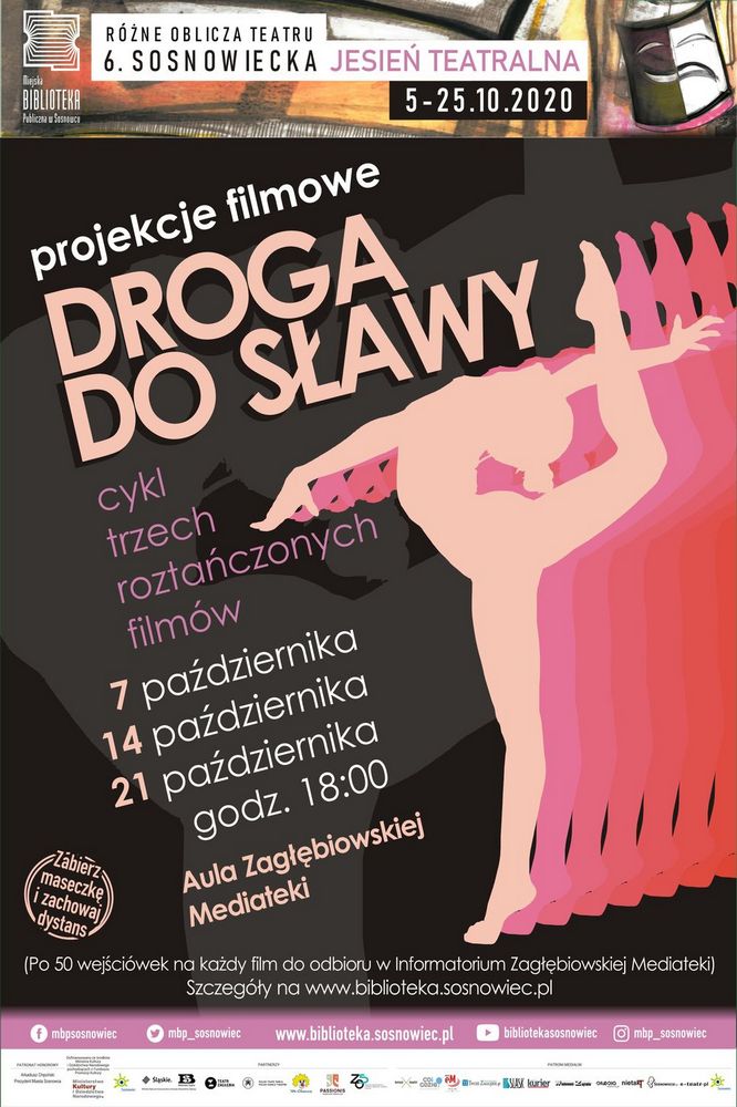 Miejska Biblioteka Publiczna w Sosnowcu serdecznie zaprasza do udziału w trzech projekcjach filmowych, których motywem przewodnim jest taniec i niełatwa droga młodych adeptów tej sztuki do realizacji swych marzeń i pasji. „Roztańczony” cykl „Droga do sławy” jest częścią programu 6. Sosnowieckiej Jesieni Teatralnej. Pokazy filmowe odbędą się w środy – 7, 14 i 21 października 2020 o godz. 18.00 w Auli Zagłębiowskiej Mediateki przy ul. Kościelnej 11 w Sosnowcu.Wstęp wolny.