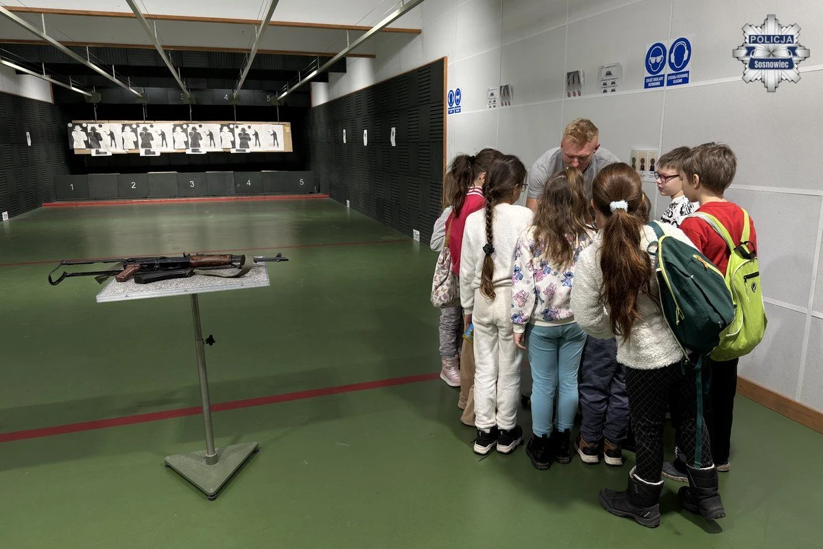 Kolejnym punktem programu była wizyta na strzelnicy. Instruktor zaprezentował dzieciom jednostki broni wykorzystywane przez Policję oraz szczegółowo omówił zasady bezpieczeństwa obowiązujące w kontakcie z bronią. Był to również moment na wspólne pamiątkowe zdjęcie, które z pewnością będzie miłym wspomnieniem z tej wizyty.
