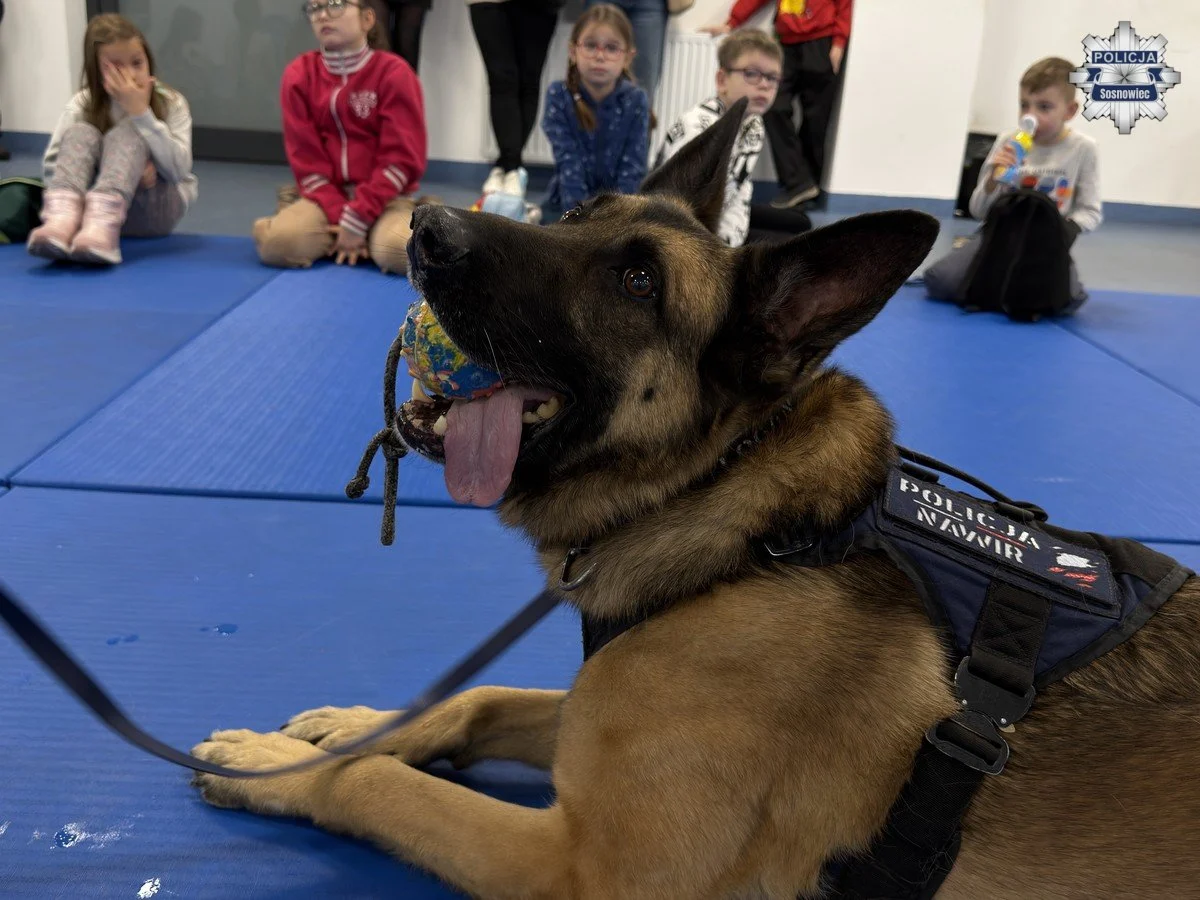Wizyta rozpoczęła się od zwiedzania sali gimnastycznej, gdzie dzieci mogły zobaczyć pokaz umiejętności psa służbowego. Czworonożny funkcjonariusz zaprezentował swoje posłuszeństwo, szybkość reakcji oraz elementy szkolenia wykorzystywane w codziennej służbie. Spotkanie z psem policyjnym wzbudziło ogromne zainteresowanie i było dla najmłodszych wyjątkowym przeżyciem.