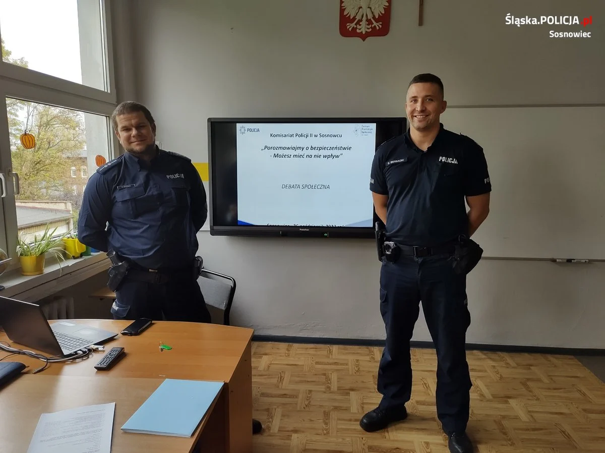Dzielnicowi z sosnowieckiej „dwójki” w ubiegły czwartek zorganizowali na terenie Szkoły Podstawowej nr 17 debatę społeczną. W spotkaniu uczestniczył również Zastępca Komendanta Komisariatu II w Sosnowcu, podinsp. Aleksander Opiełka oraz Oficer Prasowy – asp. Katarzyna Cypel-Dąbrowska.