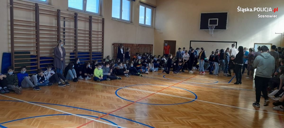 Sosnowieccy dzielnicowi z Komisariatu Policji III spotkali się z dziećmi i młodzieżą ze Szkoły Podstawowej nr 13 w Sosnowcu przy ul. Jedności. To kolejne z cyklu spotkań, podczas których mundurowi rozmawiają z uczestnikami o cyberprzemocy, bezpieczeństwie i zachowaniach ryzykownych. Luźna formuła zajęć (odbyły się w sali gimnastycznej) sprzyja przekazywaniu wiedzy młodym ludziom.