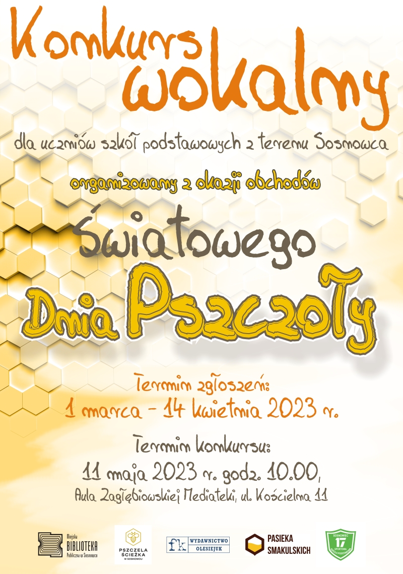 Konkurs jest organizowany z okazji Międzynarodowego Dnia Pszczoły (20 maja). Uczestników do udziału w konkursie zgłaszają nauczyciele. Z każdej szkoły nauczyciel może zgłosić maksymalnie 3 uczniów w każdej zdwóch kategorii wiekowych. Termin przyjmowania zgłoszeń: 1 marca – 31 marca 2023 r. Konkurs odbędzie się w dniu 11 maja 2023 r. o godz. 10.00 w Auli Zagłębiowskiej Mediateki (ul. Kościelna 11, poziom 0). W dniu konkursu każdy z uczestników prezentuje piosenkę o tematyce wiosennej (mile widziane utwory z motywem pszczoły). Uczestnicy występować będą w dwóch kategoriach wiekowych: uczniowie klas 1-4 oraz uczniowie klas 5-8. Fundatorami nagród w konkursie są: MBP Sosnowiec, Urząd Miasta w Sosnowcu, Pasieka Smakulskich z Pakosławia oraz Wydawnictwo Olesiejuk z Ożarowa Mazowieckiego. Szczegóły konkursu w regulaminie.