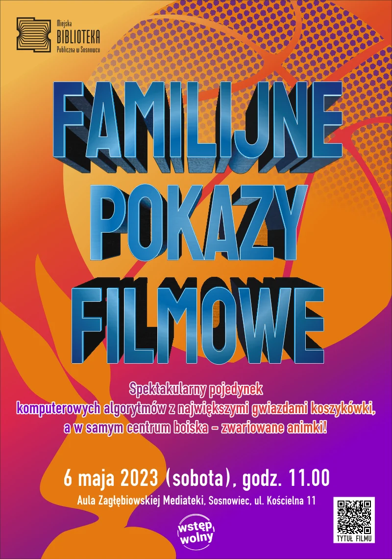 Już 6 maja (sobota) o godz. 11.00 Zagłębiowska Mediateka serdecznie zaprasza na Familijny Pokaz Filmowy. Na dzieci wraz z osobami towarzyszącymi, w Auli Zagłębiowskiej Mediateki przy ul. Kościelnej 11 w Sosnowcu, czekać będzie spektakularny pojedynek komputerowych algorytmów z największymi gwiazdami koszykówki, a w samym centrum boiska – zwariowane animki! Wstęp wolny.