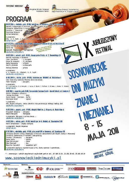 Serdecznie zapraszamy na jubileuszowy X Festiwal Sosnowieckie Dni Muzyki Znanej i Nieznanej, który odbędzie się w dn. 8-15. maja 2011 r. na terenie Sosnowca.