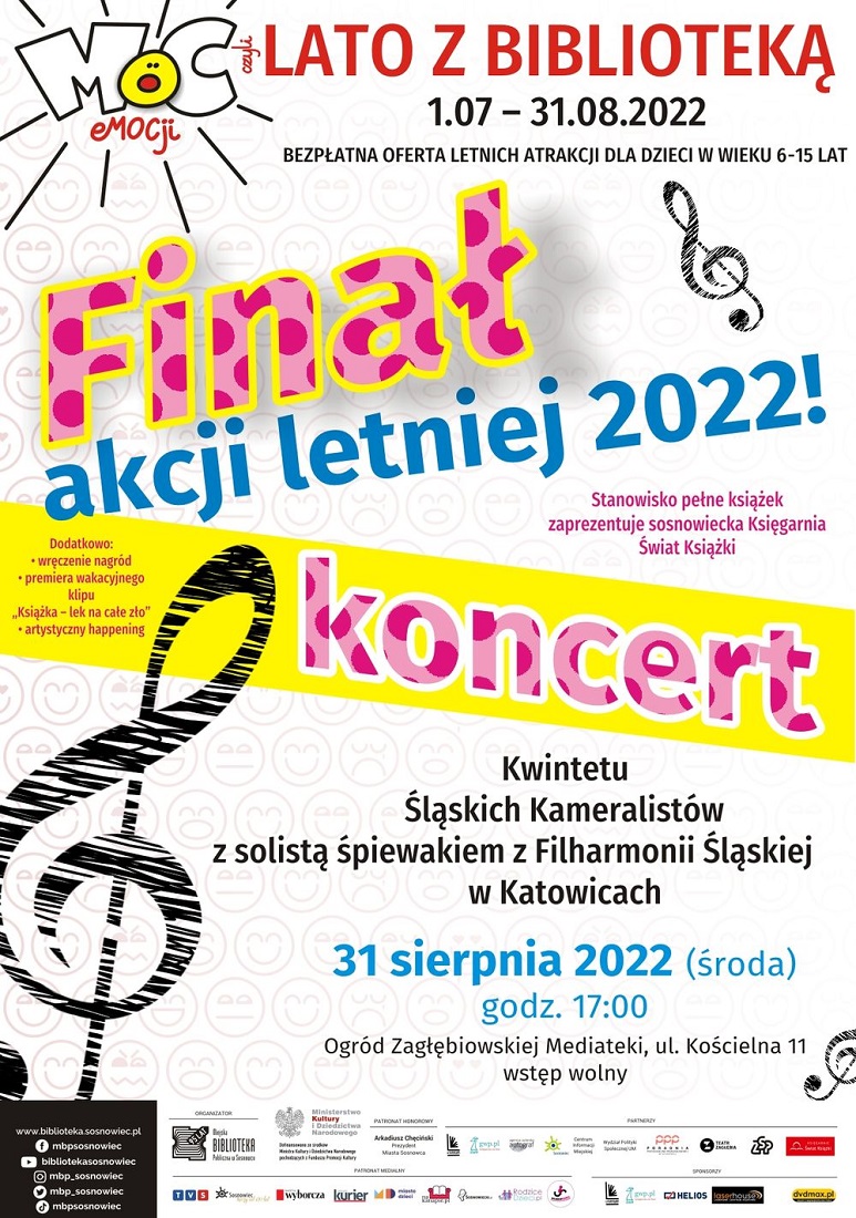 Miejska Biblioteka Publiczna w Sosnowcu – organizator akcji letniej „MOC eMOCji, czyli lato z biblioteką” – serdecznie zaprasza do udziału w wielkim finale akcji letniej, który odbędzie się w środę 31 sierpnia 2022 o godz. 17.00 w Ogrodzie Zagłębiowskiej Mediateki przy ul. Kościelnej 11 (w przypadku deszczu – w Auli Zagłębiowskiej Mediateki). Wstęp wolny.