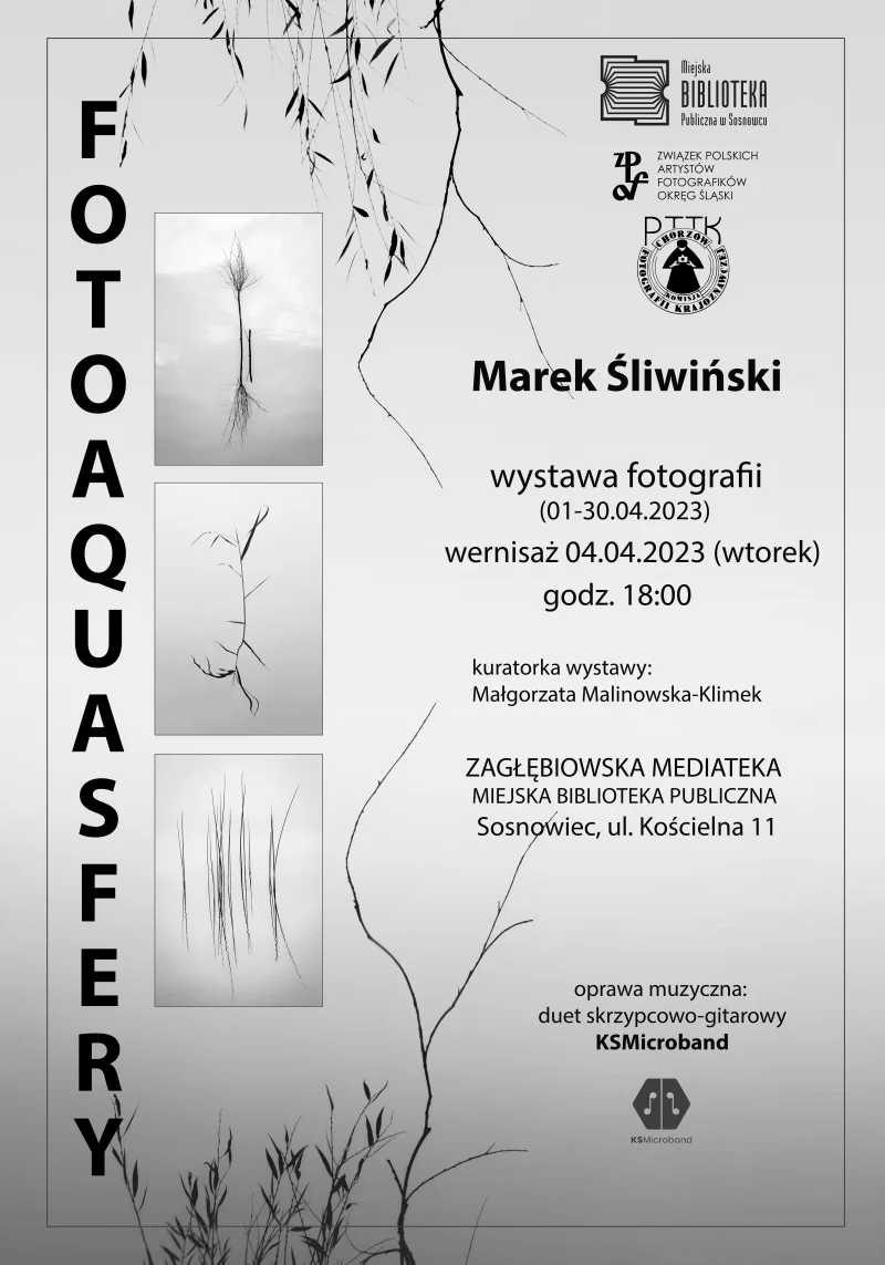Miejska Biblioteka Publiczna w Sosnowcu serdecznie zaprasza na wernisaż wystawy fotograficznej Marka Śliwińskiego „FOTOAQUASFERY”, który odbędzie się we wtorek 4 kwietnia 2023 o godz. 18.00 w Pasażu Zagłębiowskiej Mediateki przy ul. Kościelnej 11 w Sosnowcu.