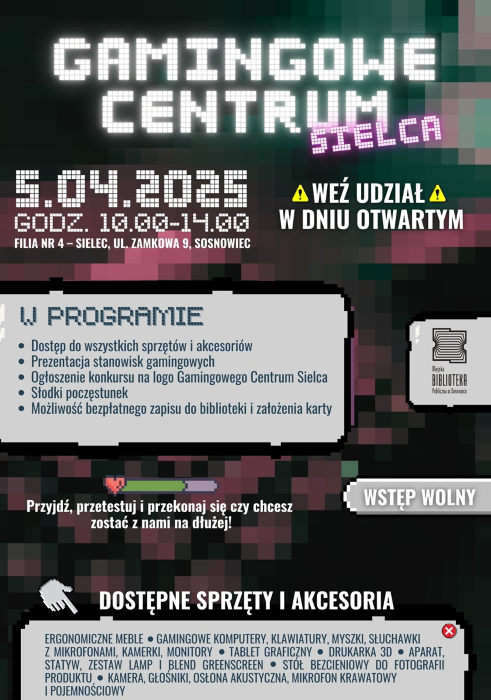 Gaming i e-sport, czyli topowa rozrywka XXI wieku. W ramach projektu zrealizowanego dzięki dofinansowaniu uzyskanemu w ramach X edycji Budżetu Obywatelskiego w Sosnowcu, jedno z pomieszczeń Filii nr 4 – Sielec zostało przekształcone w przestrzeń mieszczącą 5 w pełni wyposażonych stanowisk komputerowych, dostosowanych do potrzeb osób zafascynowanych światem gier komputerowych. Użytkownicy pracowni mają do dyspozycji ergonomiczne meble (biurka, fotele) i sprzęt (komputery, klawiatury, myszki, słuchawki z mikrofonami, kamerki, monitory).