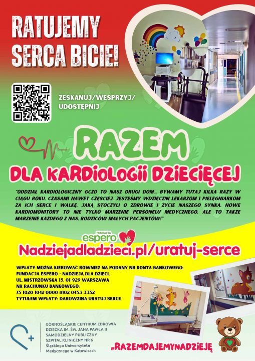 Górnośląskie Centrum Zdrowia Dziecka im.Św. Jana Pawła II w Katowicach  i Fundacja Espero rozpoczęły akcję zbierania funduszy na kardiomonitory dla Oddziału Kardiologii Dziecięcej Górnośląskiego Centrum Zdrowia Dziecka.