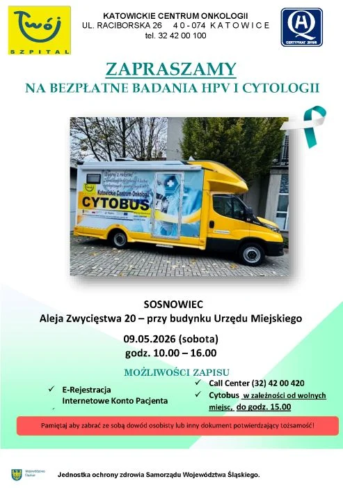 Badania będą prowadzone 9 maja od godziny 10.00 przy budynku Urzędu Miejskiego w Sosnowcu. Cytobus pojawi się tam w ramach II Sosnowieckiego Forum Zdrowia ze „Zlotem MEDtrucków”.