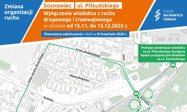 Rozpoczyna się kolejny etap prac realizowanych przez PKP PLK przy wiadukcie na ulicy Piłsudskiego. Ze względów bezpieczeństwa od 15 listopada do 13 grudnia ulica Piłsudskiego będzie zamknięta dla ruchu kołowego i tramwajowego.