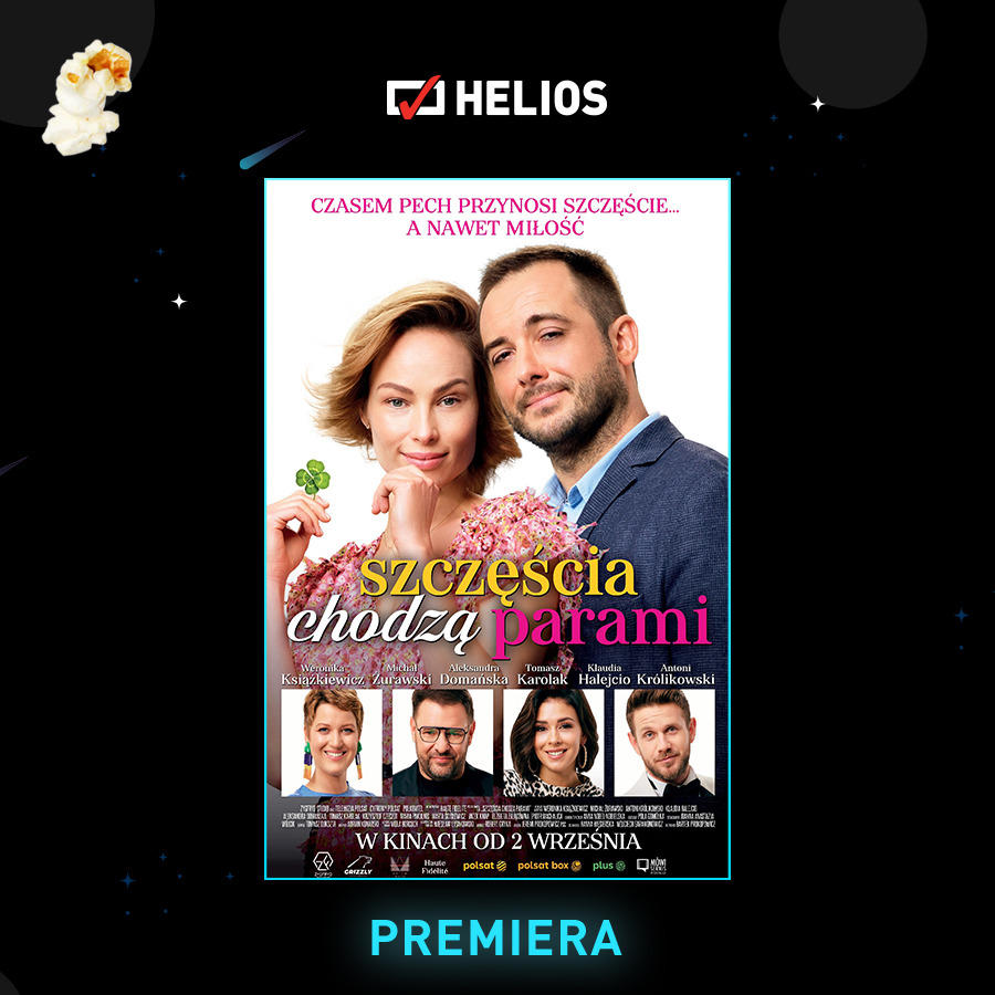 Czy pech może przynieść szczęście? A może nawet miłość? Brawurowa komedia romantyczna „Szczęścia chodzą parami” już w najbliższy piątek rozbawi do łez widzów Helios. Bohaterką filmu jest Malwina przebojowa projektantka samochodów, która zakochujesię w Brunonie, wziętym terapeucie par. Choć potrafi on uratować każdy związek, to jego własne historie miłosne tworzą serię katastrof. Przystojny i zabawny, mógłby być mężczyzną marzeń, gdyby nie to, że sprowadza na swoje dziewczyny pecha, który kończy nawet najbardziej płomienny romans. Nieświadoma ryzyka Malwina, ulega jego czarowi od pierwszego wejrzenia. Tym razem Bruno nie zamierza się poddać.