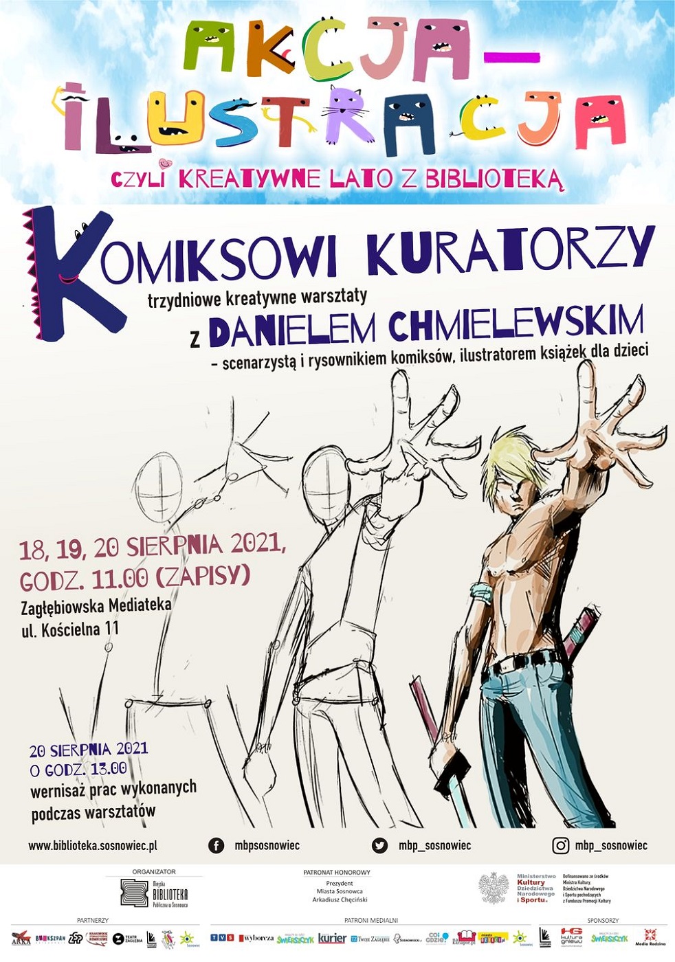 Miejska Biblioteka Publiczna w Sosnowcu – organizator wakacyjnego projektu „Akcja-ilustracja, czyli kreatywne lato z biblioteką” – serdecznie zaprasza do udziału w warsztatach z Danielem Chmielewskim – scenarzystą i rysownikiem komiksów, ilustratorem książek dla dzieci. Rozwijające wyobraźnię i kreatywność warsztaty „Komiksowi kuratorzy” potrwają aż TRZY DNI – 18, 19, i 20 sierpnia 2021 o godz. 11.00 w Zagłębiowskiej Mediatece (ul. Kościelna 11). Na zakończenie warsztatów odbędzie się wernisaż prac wykonanych przez uczestników (20sierpnia 2021, godz. 13.00). Wstęp wolny – obowiązują zapisy.