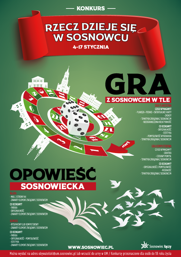Wymyśl grę planszową lub grę komputerową. Grę planszową wykonaj dowolną techniką i dostarcz ją do Wydziału Kultury i Promocji Miasta. W przypadku gry komputerowej prześlij link do gry na adres mailowy: [email protected]