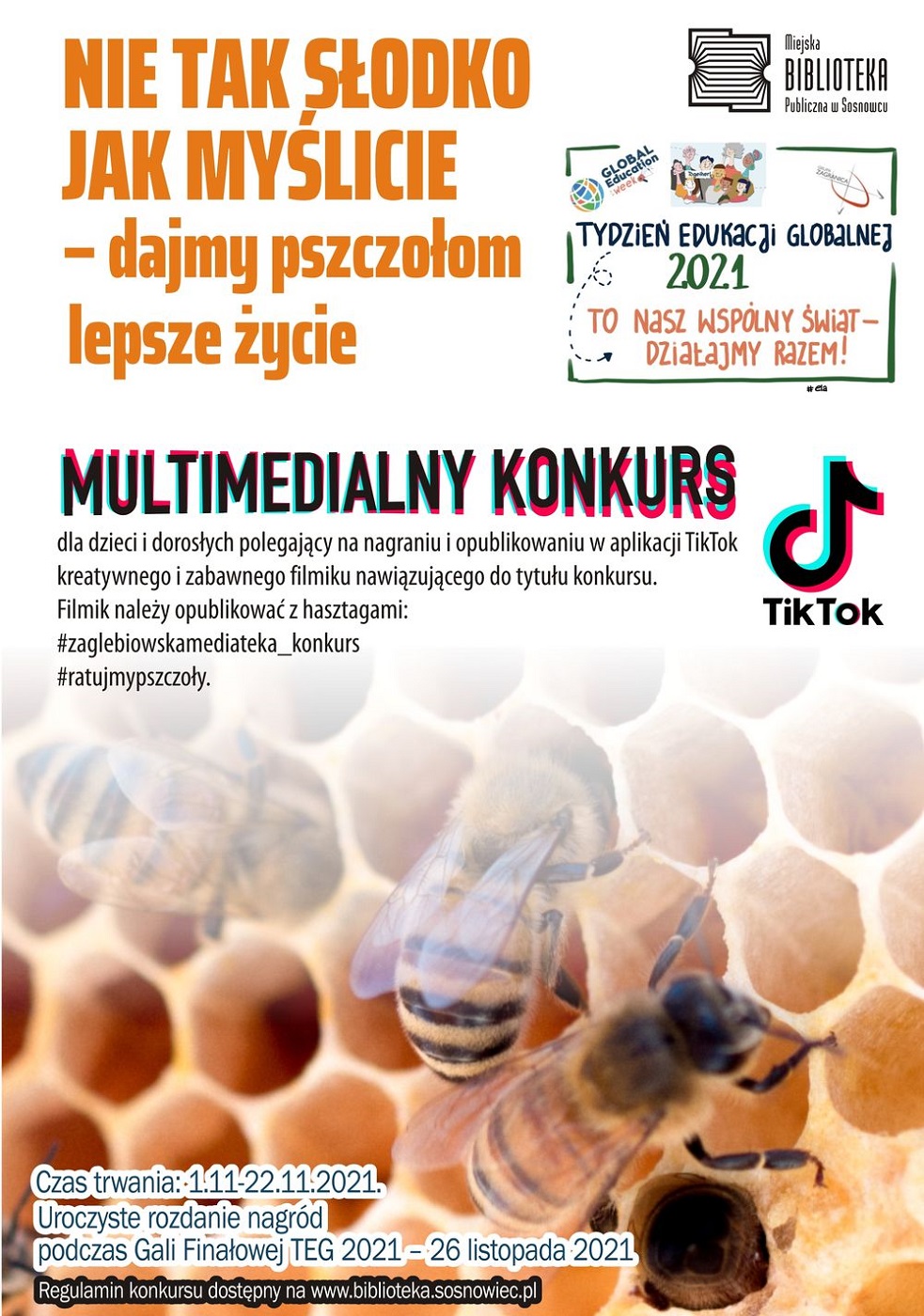 Konkurs rozpoczął się 1 listopada 2021, a ostateczny termin nadsyłania prac upływa 22 listopada 2021. Zadanie konkursowe polega na nagraniu i opublikowaniu w aplikacji TikTok kreatywnego i zabawnego filmiku nawiązującego do tytułu konkursu. Filmik należy opublikować z hasztagami #zaglebiowskamediateka_konkurs #ratujmypszczoły.