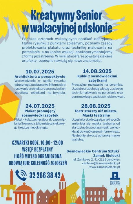 Sosnowiec ponownie zaprasza swoich seniorów do twórczego spędzenia czasu! Już w środę, 14 sierpnia w godzinach od 10:00 do 12:00, w Zamku Sieleckim odbędą się wyjątkowe warsztaty z cyklu „Kreatywny Senior w wakacyjnej odsłonie”. Tym razem uczestnicy poznają techniki malowania na ceramice, a motywem przewodnim będą sosnowieckie zabytki.