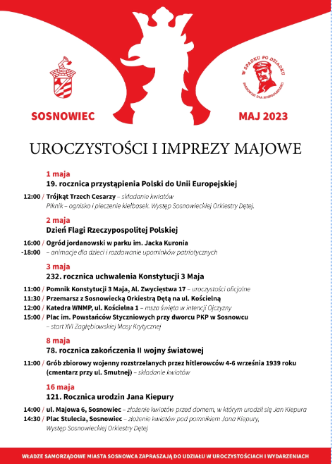 Urząd Miasta Sosnowiec zaprasza mieszkańców do wzięcia udziału w majowych uroczystościach, które odbędą się na terenie naszego miasta.
