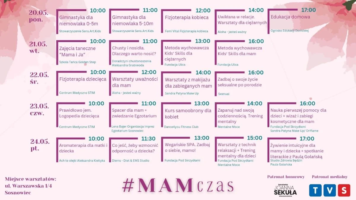 Całe wydarzenie zaplanowane jest tak, by każda z pań znalazła aktywność dla siebie i poświęciła czas również sobie. Stąd Sosnowiecki Tydzień Mam będzie odbywał się pod hasłem przewodnim #MAMczas. To wydarzenie organizowane przez kobiety, dla kobiet, dlatego z dokładną starannością dobierani byli partnerzy, którzy w tygodniu 20-26 maja zadbają zarówno o ducha, ale i cało wszystkich pań. Przewidziane są też warsztaty dla dzieci i z ich udziałem.