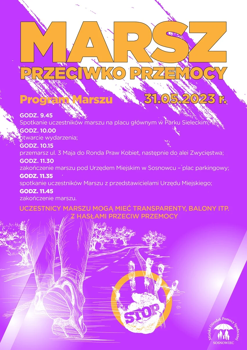 31 maja w Sosnowcu odbędzie się MARSZ PRZECIWKO PRZEMOCY, w którym wezmą udział dzieci, młodzież oraz mieszkańcy Sosnowca.