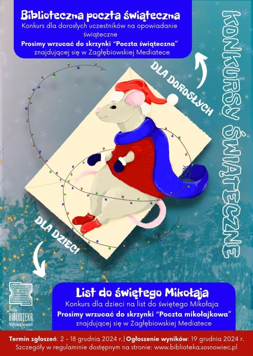 Dorośli mogą wziąć w nich udział, pisząc swoje świąteczne opowiadanie i wrzucając je do specjalnie przygotowanej świątecznej skrzynki na listy, znajdującej się w Galerii „Pod Świetlikiem” Zagłębiowskiej Mediateki (ul. Kościelna 11, poziom 0). Dzieci natomiast zachęcamy do napisania listu do Świętego Mikołaja, który wrzucić mogą do skrzynki z napisem „Poczta mikołajkowa”, znajdującej się również w Zagłębiowskiej Mediatece. Tuż przed świętami, wyłonieni oraz nagrodzeni zostaną zwycięzcy obu konkursów.
