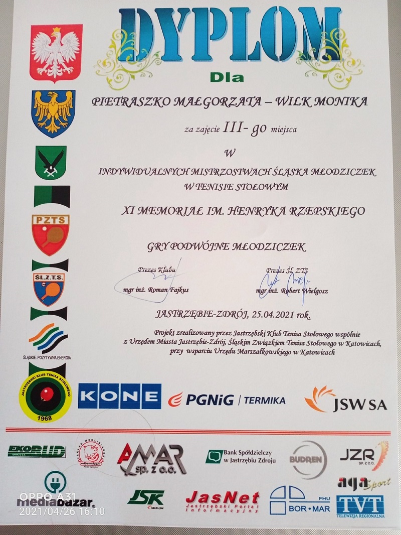 W dniu 25.04.21 r. w Jastrzębiu-Zdroju odbyły się Indywidualne Mistrzostwa Śląska Młodziczek i Młodzików w tenisie stołowym.
