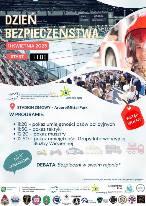 1 kwietnia, w godzinach 11.00-14.00, na terenie Stadionu Zimowego ArcelorMittal Park – ZPS Sosnowiec odbędzie się Dzień Bezpieczeństwa. Głównym organizatorem wydarzenia jest SP ZOZ Rejonowe Pogotowie Ratunkowe w Sosnowcu oraz Urząd Miejski w Sosnowcu.