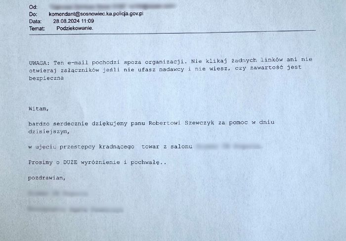 Wdzięczni pracownicy sklepu skierowali do Komendanta Miejskiego Policji w Sosnowcu podziękowanie za reakcję policjanta.