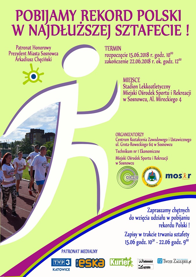 Do udziału w najdłuższej w Polsce sztafecie biegowej można zgłosić się przez cały czas jej trwania. Uroczyste zakończenie rekordowej sztafety przewidziano na 22 czerwca na godzinę 12:00. Zadanie, które stoi przed mieszkańcami Sosnowca nie należy do najprostszych, ponieważ Rekord Polski w najdłuższej sztafecie biegowej ma trwać aż 170 godzin, czyli ponad 7 dni! Patronat honorowy nad całym wydarzeniem objął Prezydent Miasta Sosnowca – Arkadiusz Chęciński.