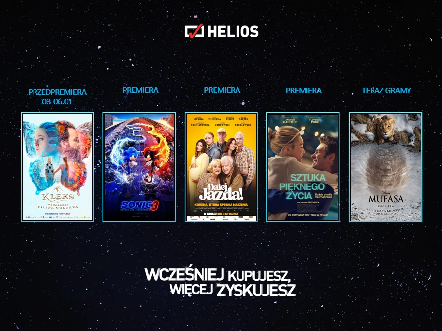Ponadto w repertuarze kin Helios znajdą się tytuły, które już zostały ulubieńcami widzów. „Listy do M. Pożegnania i powroty” to ciepła, świąteczna komedia romantyczna w gwiazdorskiej obsadzie, pełna różnorodnych wątków. Wspólnym mianownikiem ukazanych historii jest przeżywanie gwiazdkowego czasu na odmienne sposoby, a także próba odnalezienia miłości i przyjaźni. „Mufasa: Król Lew” to z kolei produkcja poświęcona historii legendarnego króla Lwiej Ziemi. Mufasa zostaje ukazany jako osierocone i zagubione lwiątko. Ratuje go Taka – dziedzic królewskiego tronu. To przypadkowe spotkanie staje się początkiem podróży w poszukiwaniu swojego przeznaczenia.