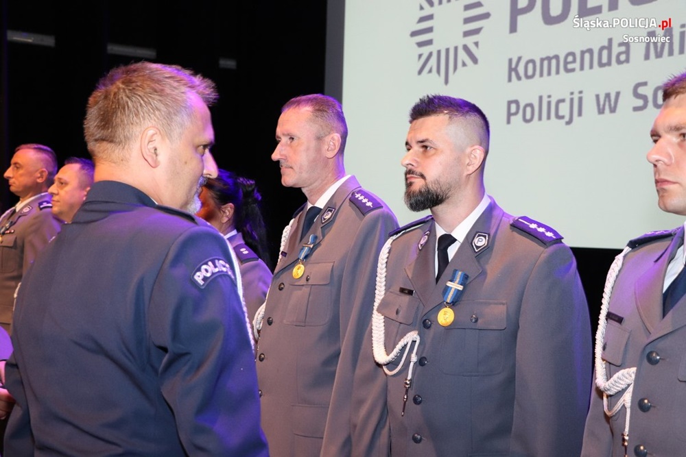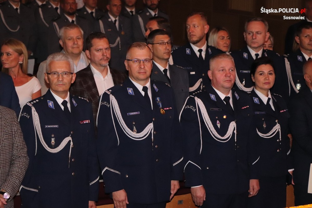 Uroczysta zbiórka rozpoczęła się o godzinie 12 w ubiegły piątek w Sali Widowiskowo-Koncertowej Muza w Sosnowcu. Z okazji Święta Policji w 2023 roku mianowania na wyższy stopień policyjny otrzyma łącznie 138 sosnowieckich policjantów. Uroczystość była również dobrą okazją do wręczenia nagród przez Prezydenta Miasta Sosnowca, Arkadiusza Chęcińskiego 9 policjantom z terenu naszej jednostki, którzy w minionym roku wykazali się szczególnymi osiągnięciami w służbie. Przedstawiciele NSZZ Policjantów Województwa Śląskiego i Prezes Zarządu Koła Stowarzyszenia Emerytów i Rencistów Policyjnych w Sosnowcu wręczyli wyróżnionym policjantom odznaczenia.