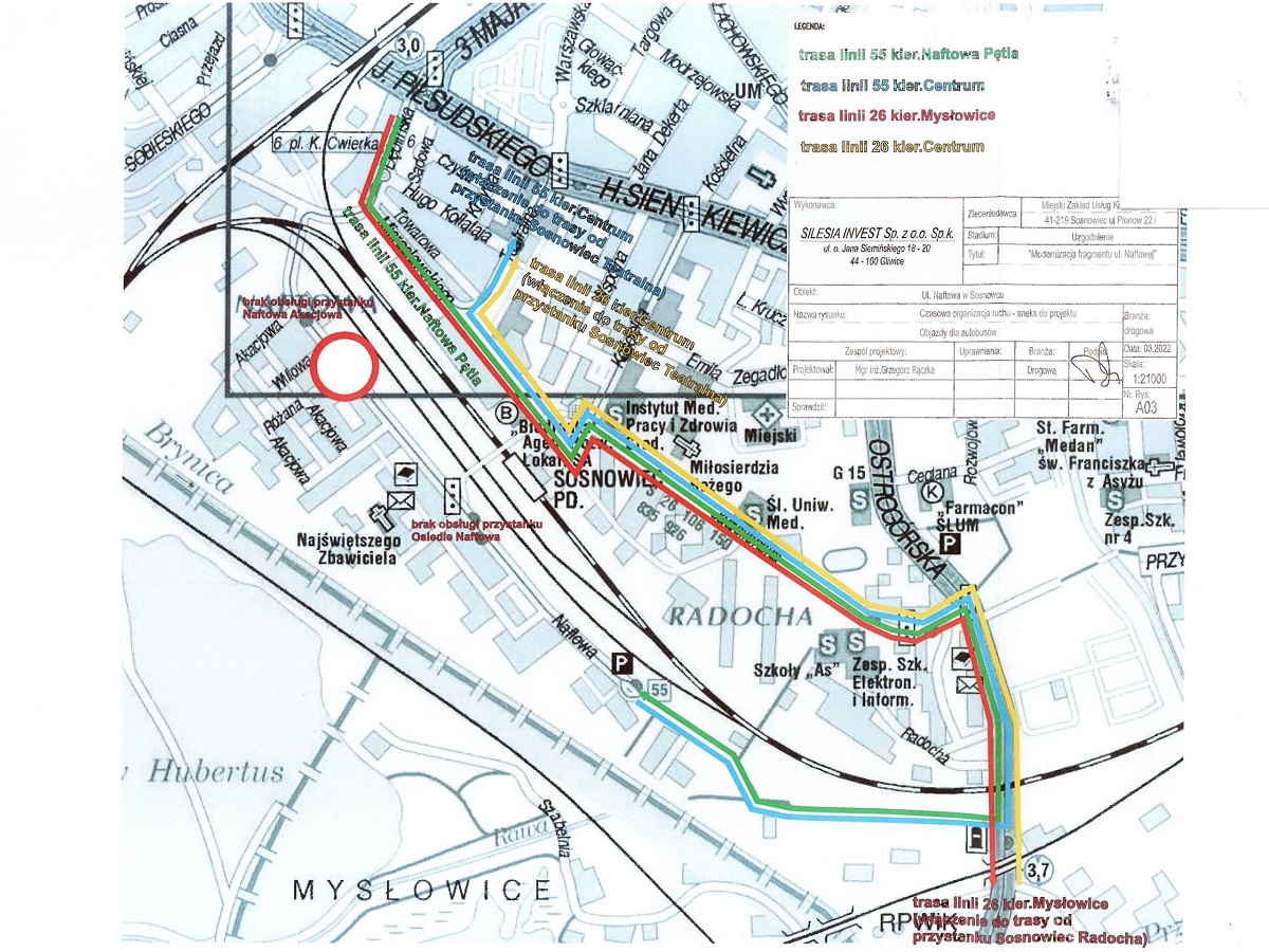 Linia nr 55 będzie kursowała od Dęblińskiej ulicami: Mierosławskiego, Kościelną, Jagiellońską i Naftową do przystanku „Sosnowiec Osiedle Naftowa Pętla”. Trasa powrotna do ulicy Teatralnej będzie przebiegała analogicznie. Do obsługi włączone zostaną przystanki znajdujące się na trasie objazdowej „Jagiellońska Kościół”, „Jagiellońska” i „Radocha Naftowa”.