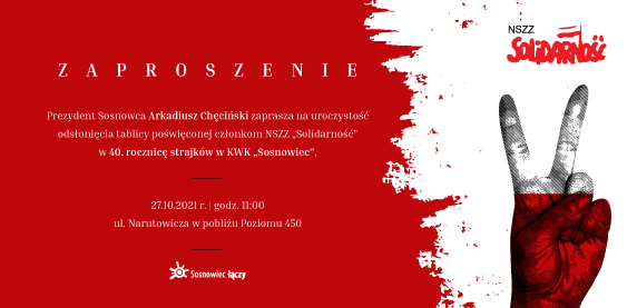 Prezydent Sosnowca, Arkadiusz Chęciński zaprasza 27 października o godz. 11.00 na uroczystość odsłonięcia tablicy poświęconej członkom NSZZ „Solidarność” w 40. rocznicę strajków w KWK „Sosnowiec”.