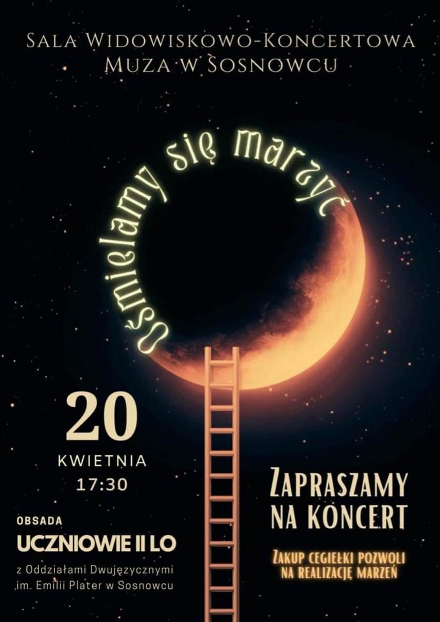 Społeczność II LO im. E. Plater w Sosnowcu serdecznie zaprasza na koncert.Zebrany dochód zostanie przeznaczony na realizację marzeń młodzieży na warsztatach poprowadzonych przez wykładowców i egzaminatorów PWST w Warszawie.Tagi:dochódliceumKoncertWarsztaty