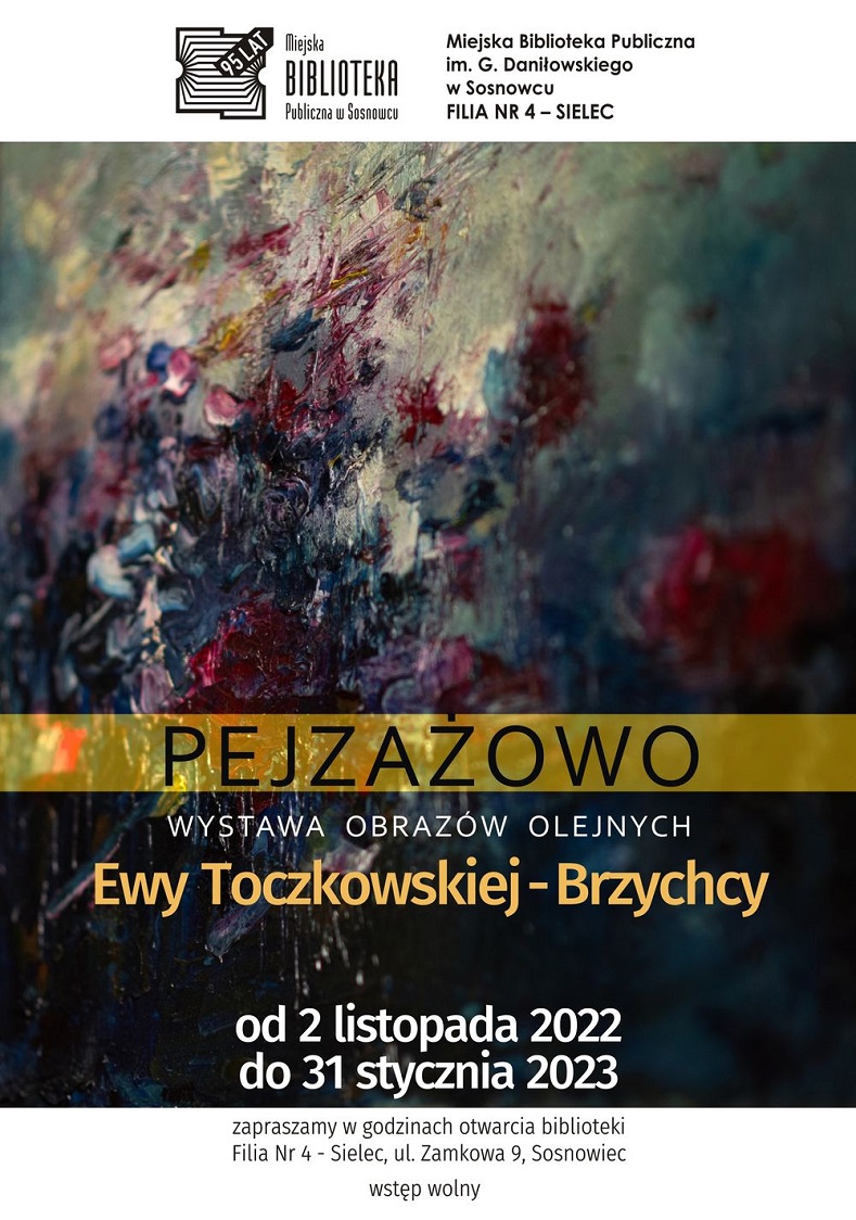 W galerii biblioteki przy ul. Zamkowej 9 prezentowane są obrazy olejne autorstwa Ewy Toczkowskiej-Brzychcy, absolwentki ASP w Katowicach. Tytuł wystawy to „Pejzażowo”, a sielecka Filia jako pierwsza prezentuje nowy projekt Autorki. Zapraszamy od 2 listopada 2022 do 31 stycznia 2023 roku, wgodzinach otwarcia biblioteki. Wstęp wolny.