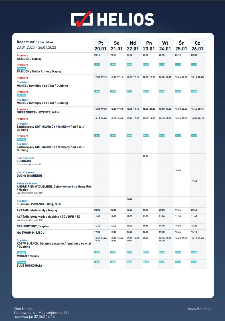 Bogatą ofertę Heliosa uzupełniają: bijąca rekordy kontynuacja wielkiego światowego hitu „Avatar: Istota wody”, porywająca animacja dla całej rodziny „Kot w butach. Ostatnie życzenie” – sequel nominowanego do Oscara hitu z 2011 roku oraz mrożący krew w żyłach horror „M3GAN” opowiadający o pozornie doskonałej lalce stworzonej z wykorzystaniem sztucznej inteligencji.