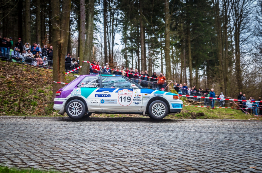 – 51 Rajd Świdnicki nie okazał się dla nas łaskawy. Po pierwszym dniu zmagań na odcinkach specjalnych objęliśmy prowadzenie. Nasza Mazda 323 GTX nas nie zawodziła. Można powiedzieć, że po 6 latach przerwy jaką mieli z moim kierowcą wiozła nas dzielnie po zwycięstwo. Drugiego dnia zmagań na dość wymagających odcinkach, gdzie było dość sporo spadań zaczęły się przegrzewać dość mocno hamulce. Przed drugą pętlą spadł lekki deszcz, niestety to wystarczyło abyśmy zakończyli rajd na legendarnych Patelniach Walimskich. Pomimo dość mocnego dohamowania do prawej patelni, wydawałoby się, że już praktycznie skręciliśmy, ale niestety puściły opony i uderzyliśmy w dość wysoki krawężnik lewą stroną. Niestety uderzenie było na tyle duże że skrzywilismy zawieszenie. Niestety dalsza jazda była już niemożliwa. Musieliśmy się wycofać z dalszej rywalizacji. Jak się okazało na serwisie pokzywiły się sworznie wahacza. Widzimy się na następnym Rajdzie Małopolskim – mówi Piotr Mitręga.