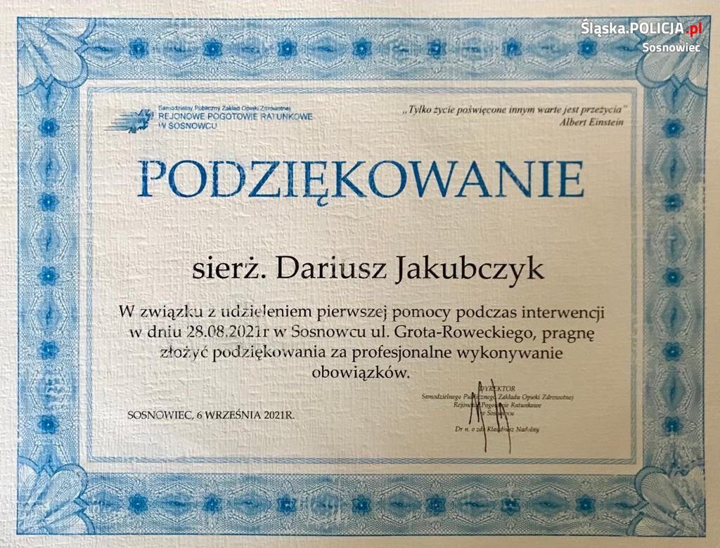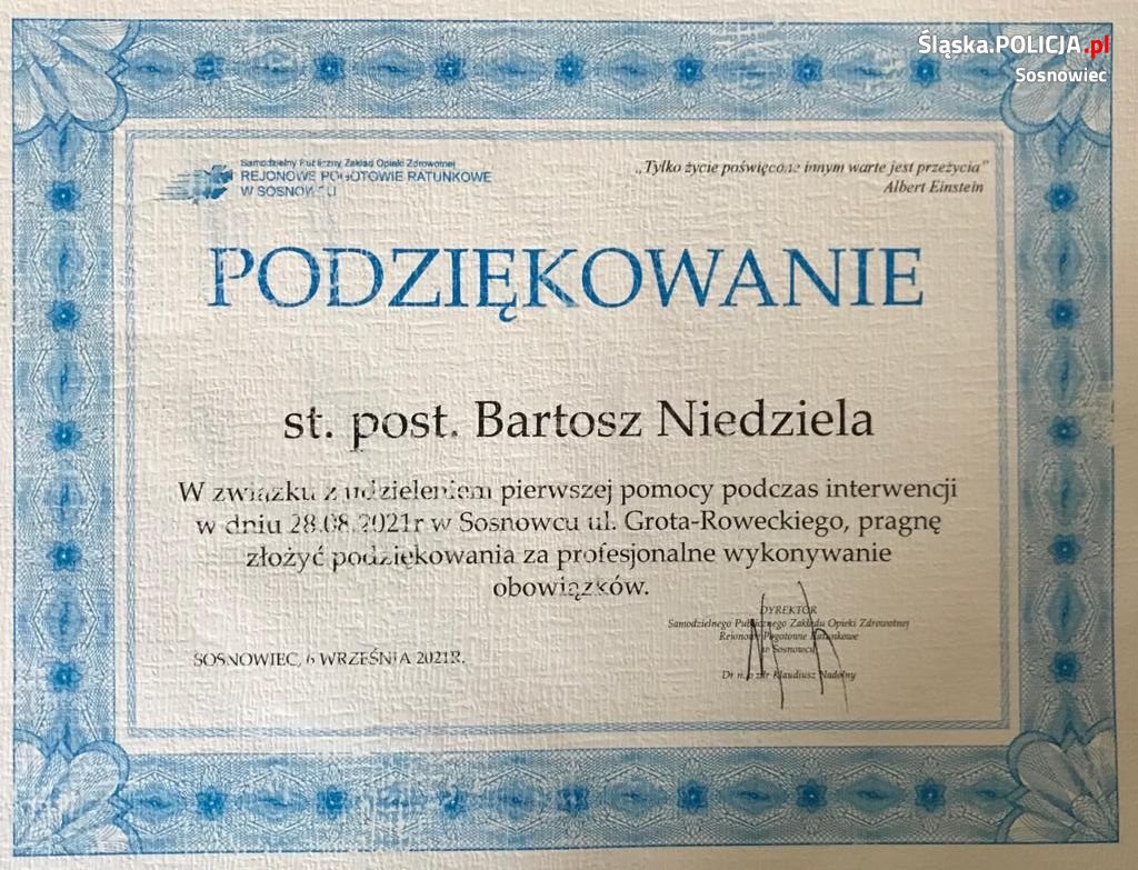 Teraz do Komendanta Miejskiego Policji w Sosnowcu płynęło pismo z Rejonowego Pogotowia Ratunkowego w Sosnowcu, w którym Dyrektor dr n.o zdr. Klaudiusz Nadolny składa oficjalne podziękowania dla sierż. Dariusza Jakubczyk oraz st.post. Bartosza Niedziela za profesjonalne udzielenie poszkodowanemu pomocy przed przybyciem ZRM. Jak pisze Dyrektor w/w policjanci „szybko i skutecznie zaopatrzyli rany mężczyzny, jednoznacznie przyczyniając się do uratowania życia i zdrowia osoby poszkodowanej”. Dyrektor pogratulował mundurowym postawy i przekazał im swoje podziękowania.