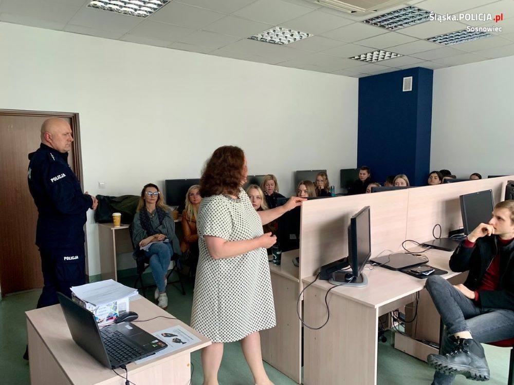 Tym razem funkcjonariusze Komendy Miejskiej Policji w Sosnowcu spotkali się ze studentami kierunku psychologii. Spotkanie prowadzone było przez aspiranta Tomasza Mogielskiego z tutejszego wydziału prewencji oraz pracownicę zespołu kadr i szkolenia. Studenci Akademii Humanitas mogli zapoznać się ze specyfiką codziennej pracy policjantów oraz stawianymi wymogami dla przyszłych kandydatów, którzy chcą związać swoje życie ze służbą mundurową. Uczestnicy spotkania mieli okazję do zadawania pytań dotyczących m. in.: wynagrodzenia, warunków socjalnych, przebiegu szkolenia oraz procesu rekrutacji.