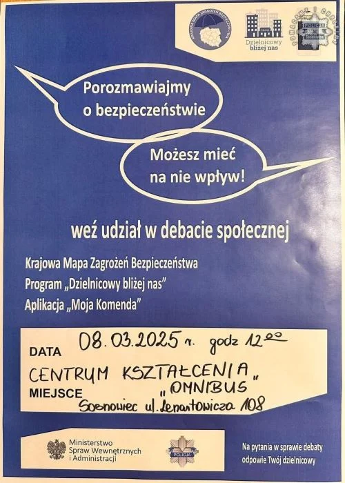 Mundurowi z komisariatu III organizują debatę społeczną dla mieszkańców dzielnicy Zagórze, która odbędzie się 8 marca, o godzinie 12.00 w budynku Centrum Kształcenia „Omnibus” w Sosnowcu przy ul. Lenartowicza 108.