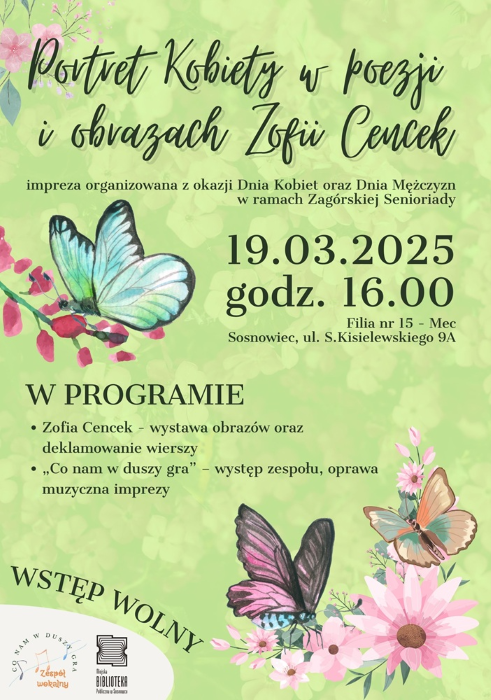 Filia nr 15 – Mec Miejskiej Biblioteki Publicznej w Sosnowcu (ul. S. Kisielewskiego 9A) serdecznie zaprasza w środę 19 marca 2025 o godz. 16.00 na wydarzenie zatytułowane „Portret Kobiety w poezji i obrazach Zofii Cencek”.