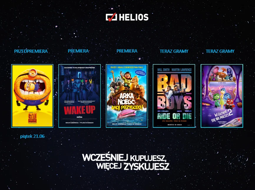 Szczegóły dotyczące czerwcowych seansów oraz bilety na wszystkie pokazy można znaleźć na stronie www.helios.pl, w aplikacji mobilnej oraz w kasach kinowych w całej Polsce. Dokonując zakupu wcześniej, można wybrać najlepsze miejsca, a także – zaoszczędzić w ramach oferty „Wcześniej kupujesz, więcej zyskujesz”.